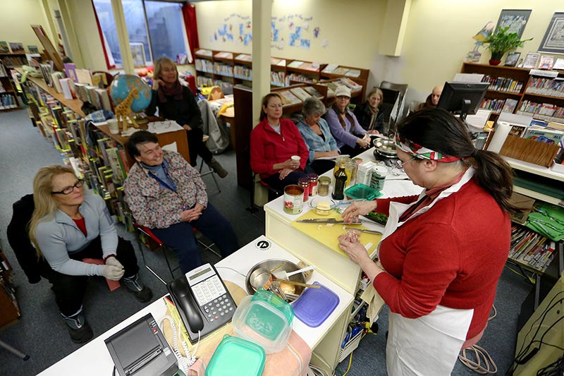 The lower level of the library — not really equipped for cooking — became a temporary kitchen with a double hot plate, sauté pans, a cutting board and knives, and a large slow-cooker sitting atop a bookcase. The 12 or so viewers (a good turnout for an especially cold day) lined up chairs along a narrow aisle. The sightlines were surprisingly good. Ms. Munro began by apologizing. “This is my first cooking demo in about 20 years,” she confessed. “But now I’m so much better a cook.”