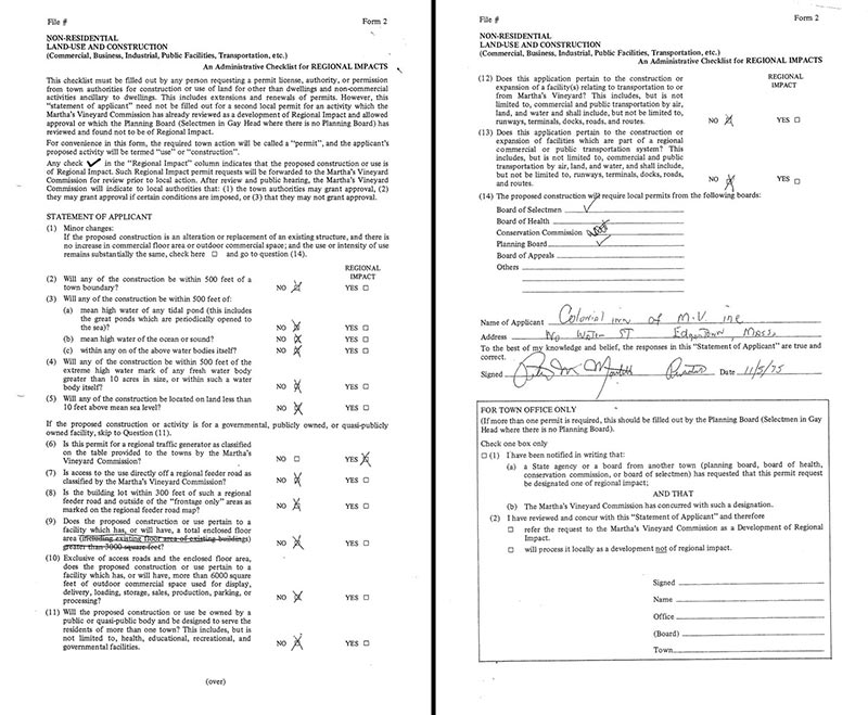 Businesspeople, property owners, developers, builders, architects, and town planners — most anyone with a building project on Martha’s Vineyard — follow a permitting route that begins with the local boards within the town where a particular development is located.