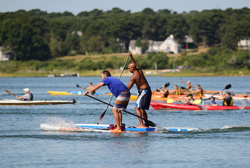 The official 2.4-mile loop course began in the calm waters at the boat launch on the pond side of Little Bridge, then continued south to Big Bridge, through the channel to Nantucket Sound, and returned along the ocean-facing beach north to Little Bridge. Sunny skies and pleasant breezes made the paddling pleasant, and splitting the race between pond and ocean provided some variation in the course.