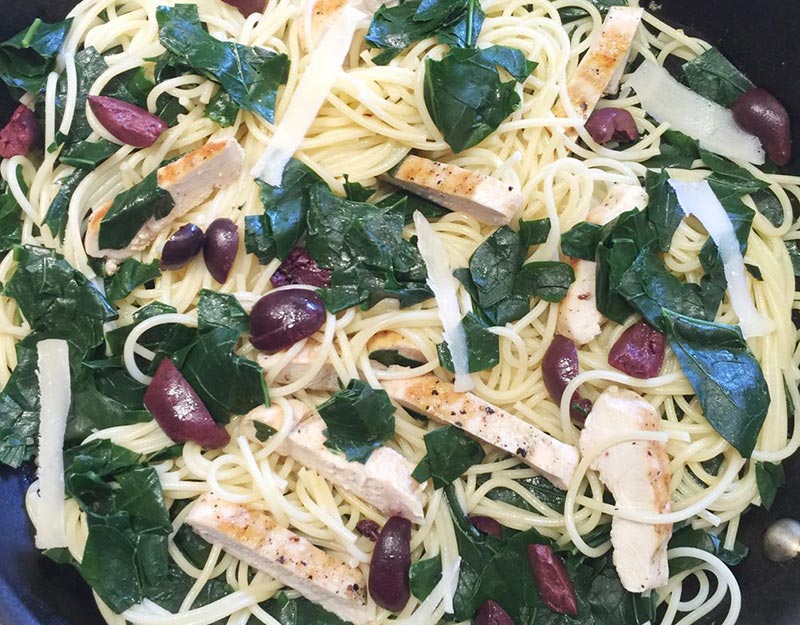 Add the hot pasta, greens, and pasta water to the garlic and aromatics. Stir well. Top with the chicken, olives, and Parmesan cheese. Serve immediately. Pass additional Parmesan at the table.