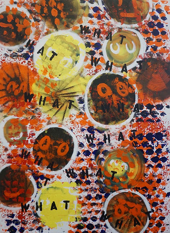 The tribute to Matisse included dots stamped by bubble wrap. She said, “When I was in my problem time with my sore hip, I couldn’t paint the way I used to. I paint on the ground; I’m sitting on my knees and painting. These came because I was sending a package and using a lot of bubble wrap. I thought I could make a painting using the bubble wrap and not have to be on my knees quite so much.” It’s an unusual technique, but created an interesting effect on the canvas, and the painted-over bubble wrap was almost as pretty as the painting itself.
