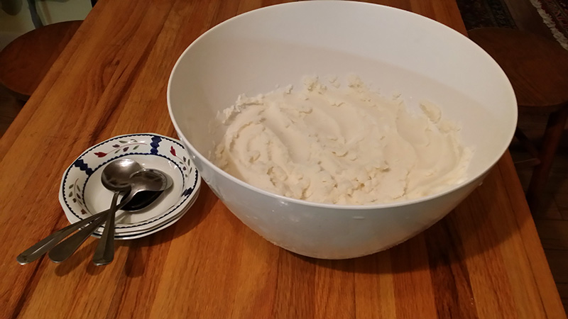 After eight inches of snow (more if you’re lucky), scrape off the top two inches (unless it’s still snowing and fresh, then the top’s OK), and fill a large mixing bowl with snow.