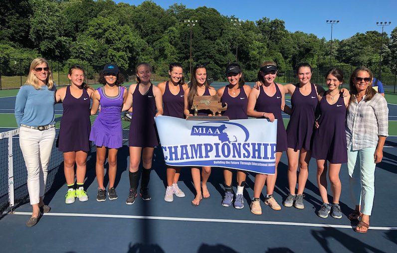 The MVRHS girls tennis team won a fourth consecutive state championship and first at the Division 2 level, by defeating Winchester High School 4-1 on Tuesday afternoon at Newton South High School.