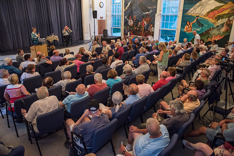 Answering questions from moderator Judy Crawford, as well as anyone who wanted to chime in, Dershowitz said his intentions were never to support the actions of a damaging and virulent president, despite what many Chilmark natives and buddies (or former buddies) of Dershowitz have come to believe.