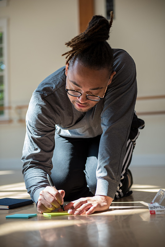 Following a residency at the Bronx Museum of the Arts, McQueen used his first Vineyard Arts residency this past June to make multiple edits to his completed draft of “Rite,” radically changing a significant element of the work. Initially designed to use projections, McQueen, who wants this work to tour to all types of theaters, schools, and festivals, made the practical decision to cut the technically complex and expensive projections. After wracking his brain, he eventually substituted a recorded voice over the already chosen music, Igor Stravinsky’s four-hand arrangement of “Rite of Spring,” to great effect. Having an entire week to step back and view live runs of “Rite,” to think, dream, and revise, was an artistic luxury. McQueen used this gift of time and space from Vineyard Arts well. He finds gesture, facial expression, and energy as intriguing as the actual movements and spacing, and refined accordingly. McQueen searches his gut for what is working and what is not, the mark of a mature artistic ego.