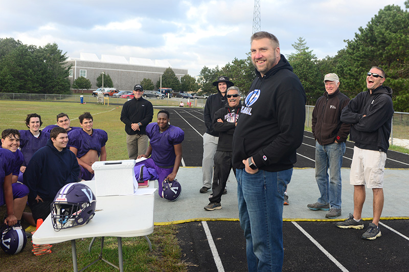 “This is a little different for me. I’m used to coaching against you guys,” he told the 30 or so varsity Vineyarders who were paying absolutely rapt attention. Lane is a volunteer football coach at Georgetown High School (GHS), with which MVRHS has scrimmaged in the preseason for three of the past four years. The reason that happens is that the GHS Royals head coach is former MVRHS standout Eric McCarthy, scion of the McCarthy family sports dynasty here.