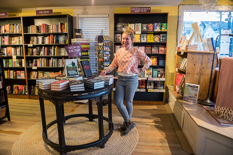 Meet Molly Coogan. She’s the manager and event coordinator at Bunch of Grapes Bookstore in Vineyard Haven. She’s been in her position for five years, and works in an office upstairs next to the children’s books section. When I interviewed her, she wore an off-white sweater with high-waisted jeans and Blundstone boots.