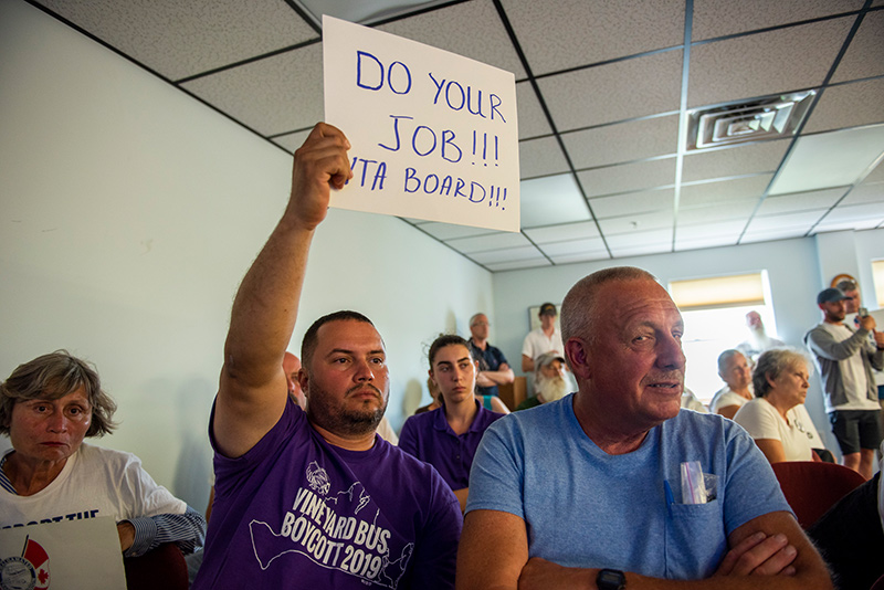 The board’s meeting room was filled with members of the public, town administrators, selectmen, VTA drivers on strike, TCI administration, VTA administration, and even two Edgartown Police officers. Members of the Amalgamated Transit Union (ATU) live-streamed the meeting on the Support Our Bus Drivers Facebook page.