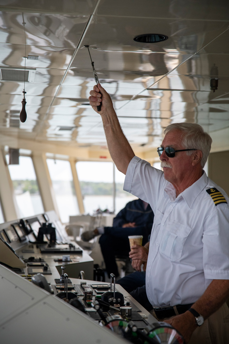 Compressed air blows through the antique whistle with air tanks fastened behind the steamboat’s pilothouse. The captain pulls cord to sound the whistle right when the ferry leaves the dock. According to Cleasby, the ships’ whistles are rare because each ship’s voice had to be unique and indistinguishable from another vessel’s whistles.