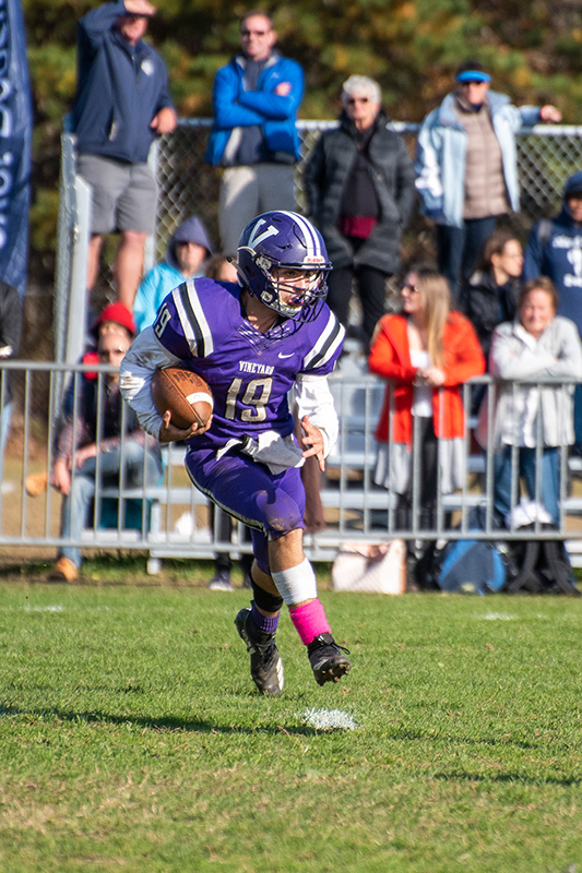 Finally, MVRHS got on the board when Antone Moreis took short kickoff at 27, burst up the middle and down the left sideline for a 73-yard TD. The PAT failed, but the Vineyarders closed the gap to 34-6.