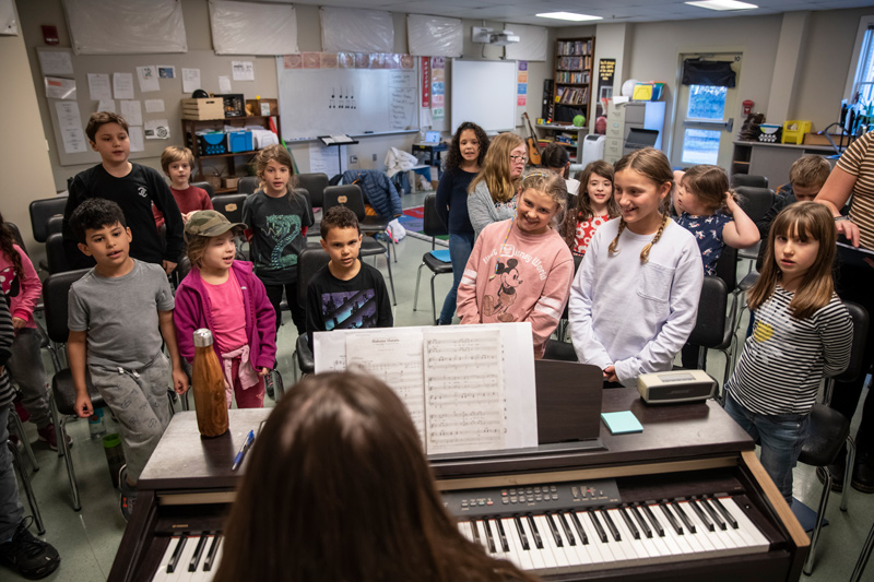 Crescendo Youth Choir, children sing together, diminutive first-graders standing beside towering eighth graders, joining voices in classic songs from many traditions. Every Monday afternoon, they practice in the Edgartown School’s music room. Laura Walton, called “Miss Walton” by her students, leads the group with unflappable cheer and patience. She guides them through the music, coaxing them to focus and bringing them together. Walton sits at the piano, making eye contact with the students, and getting them moving in an organized way when they get fidgety, bringing their energy back to the music in front of them.