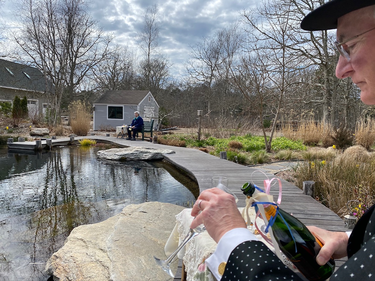 At the wedding, their neighbor officiated the ceremony from a dock jutting out into their newly built pond. Their two friends sat across the pond to share in the special moment. Afterwards, each had wine from an individual sanitized bottle, while the bride and groom toasted with champagne at a small table.
