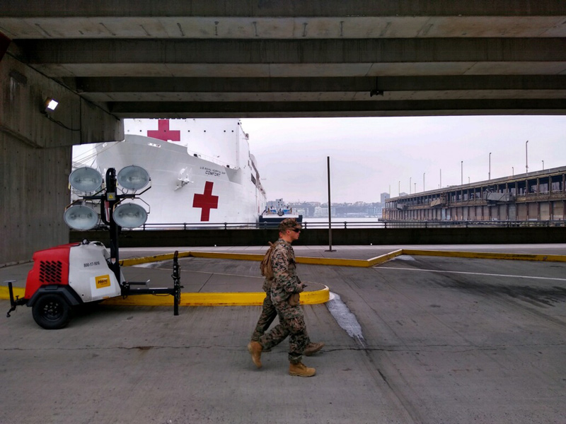 Just a few blocks farther west of me is the Hudson River and the location of the hospital ship. I walked over to see it on the day it docked there, next to the Intrepid. The area is fenced off, with military personnel walking around on either side of the fence. It doesn’t really look like a boat at all — more like a floating metal building painted white with red crosses on all sides. I didn’t go in the morning when the ship was docking and a crowd showed up to welcome its arrival. I waited until later in the day when there were only a few people peering through the fence and snapping photos.