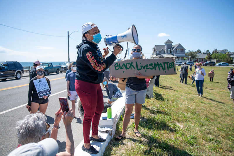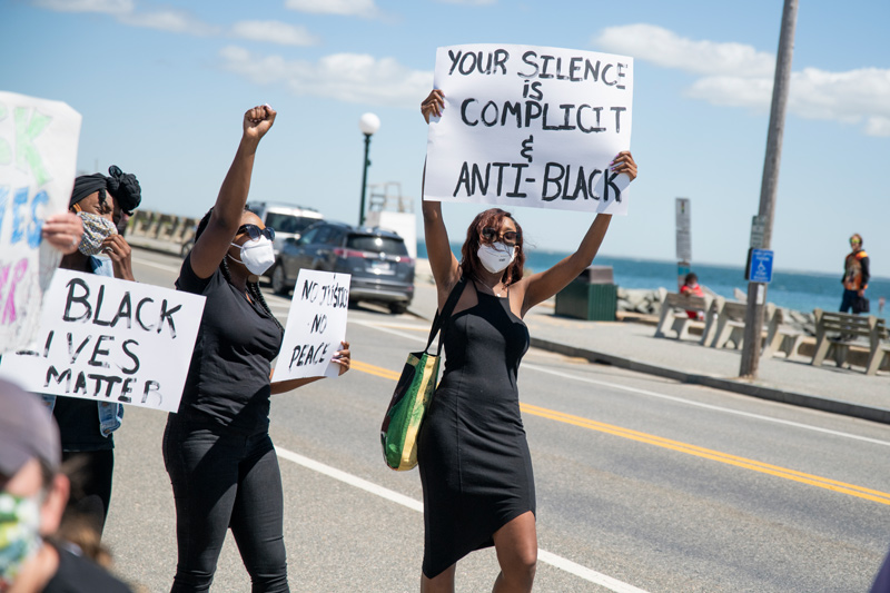 Oak Bluffs planning board chair Ewell Hopkins expressed dismay at the rally. On a sidewalk across Seaview Avenue from the park, Hopkins told the Times the rally was “well-meaning” but in violation of Gov. Charlie Baker’s prohibition on gatherings of more than 10 people. He described the event as orchestrated through “blatant white privilege.” Hopkins later told The Times, “We all found out, us elected officials, last night.” Hopkins argued public health was put at risk.