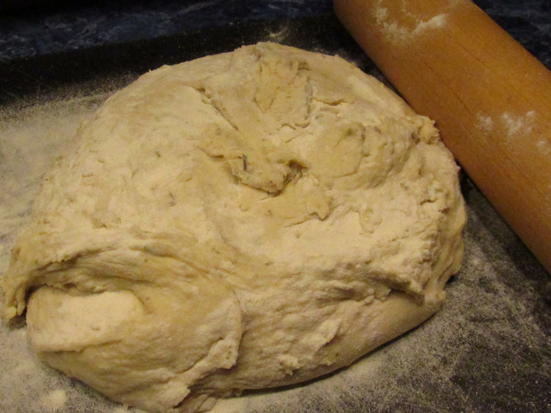 Put plastic wrap over the large mixing bowl, and place in the fridge to rest for 15 minutes. While waiting for the dough to set, put some flour onto a large cutting board and a rolling pin so the dough doesn’t stick to them. Preheat the oven to 350°.