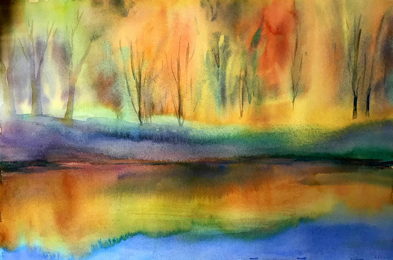 What really strikes the viewer upon entering the lobby/art space is the explosion of color. Feldman had a fondness for — and an eye for — color, and was expert at exploring unusual combinations. In one long horizontal piece, a copse of trees, represented by some simple lines and a soft focus cloud of muted green, inhabit a landscape ablaze in oranges, reds, and purples, with a slit of vibrant blue ocean in the background. The effect is an ode to the majesty and mystery of nature.
