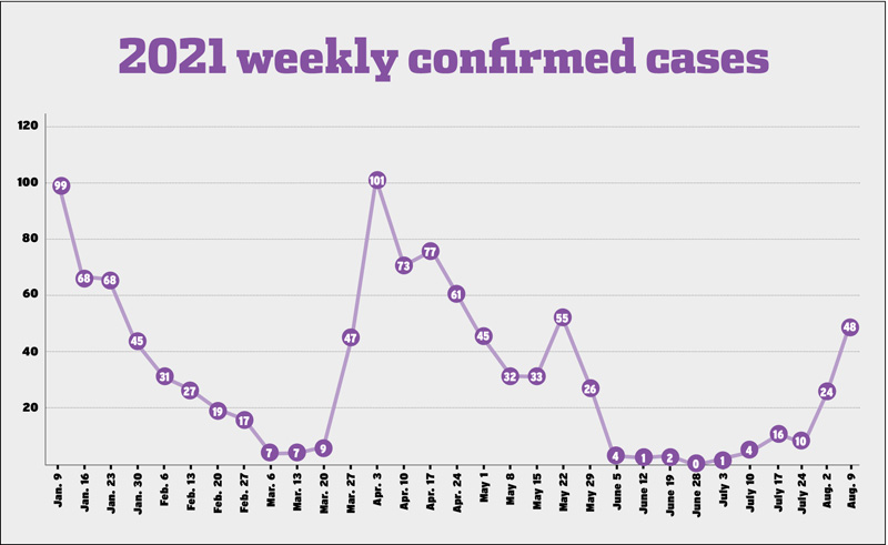 New COVID-19 cases doubled last week to 48 and include three new COVID clusters, according to the Martha’s Vineyard boards of health report.