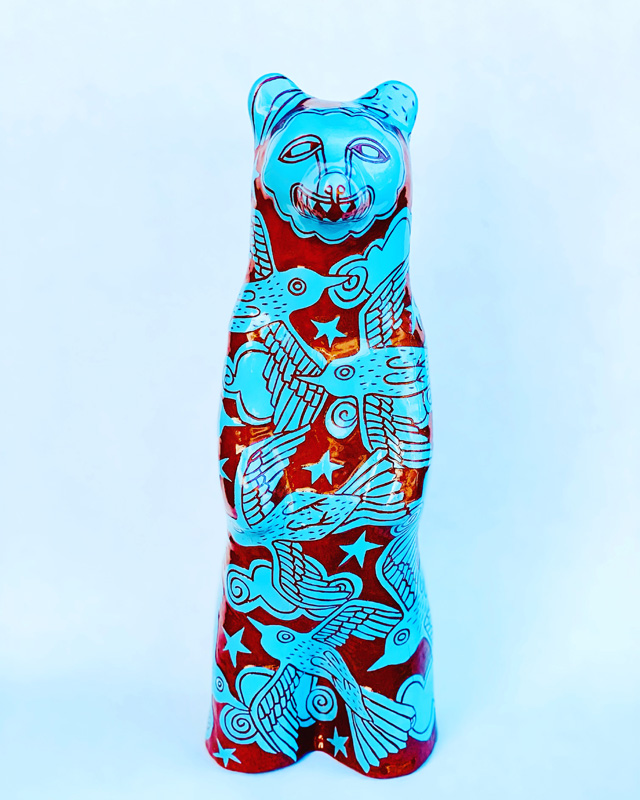 One of the local artist’s most popular designs is a whale resting atop a wave-embellished platform. For these small sculptures, Kuhe has chosen, appropriately, sea-themed designs. One of her whales features a central image of a schooner, fish leaping from the waves, and floral and astronomical imagery, creating a design that recalls scrimshaw but with a far more elaborate and fantastical bent. For another whale, the artist has incorporated a swimming female form and a seal mirroring her movements, set among fish and sea vegetation rendered in vivid blue. Platters are variously decorated with a regal red lion, a serpent slithering through dandelions, and a harpie (a mythological beast with the body of a bird and the head of a woman).
