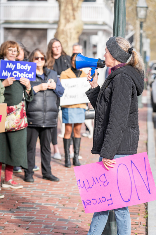 Carla Cooper of Indivisible Martha’s Vineyard, a grassroots movement with the aim of helping guide political and social progress, took to a megaphone to address the crowd. “I think all of us know someone who, or we ourselves, have an abortion story, maybe even from the ‘before times,’’’ she said, referring to abortion practices prior to the Roe v. Wade decision. On the consequences overturning could have, Cooper said, “a 10-year-old victim of rape would be forced to give birth.”