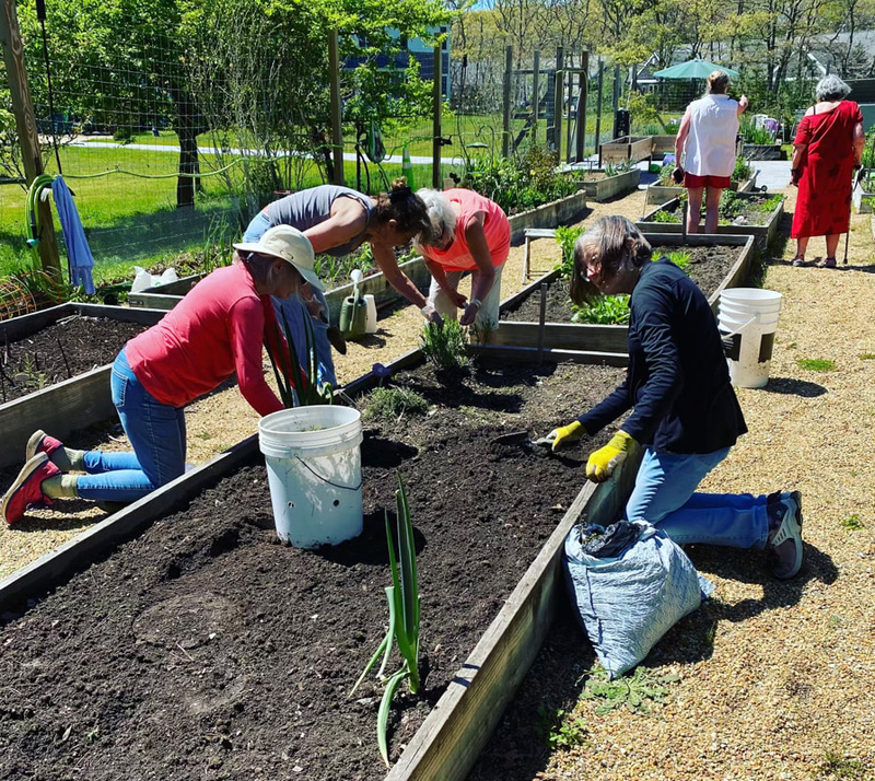 Collaboration was recently evident in the community garden on the Woodside Village campus of Island Elderly Housing (IEH) in Oak Bluffs on a Sunday afternoon as MV Grower, members of the Martha’s Vineyard Garden Club, and IEH tenants came together for an afternoon of planting and camaraderie that one tenant called “the best party ever.”