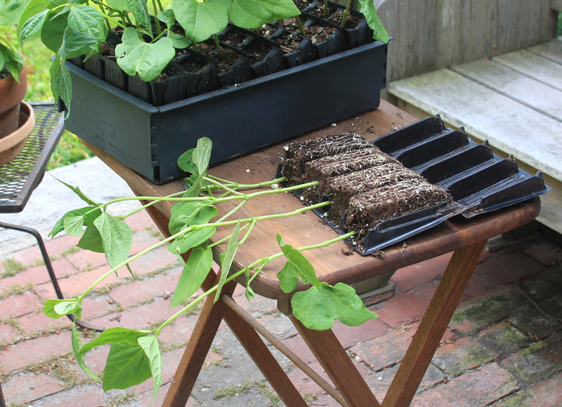 Mid-July: Time to establish late summer and fall crops. The root trainers (pictured) were sown with 16 each ‘Romano’ and ‘Maxibel’ seeds and inoculant, to minimize root disturbance when ready to go into the ground. For the average household, small sowings of vegetables such as beans and greens make more sense than large ones; heat encourages bolting.
