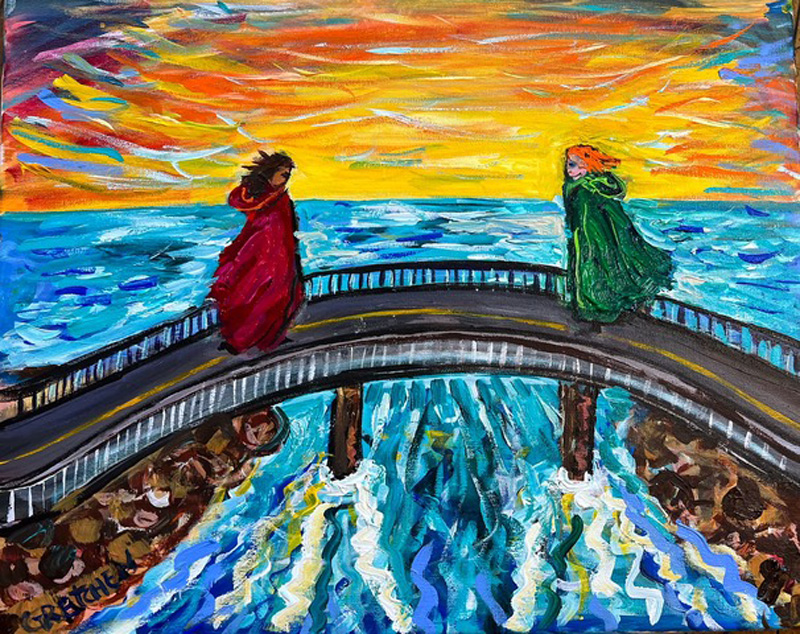 As the game, evolved it developed one rule: The artists had to include images of both of them in their paintings. For one set they decided to depict a memory from their shared past. Hackett painted the two creating a huge mural on paper, where each started at one end and they met in the middle. Baer was inspired by a time when the two women decided to meet on the “Jaws” Bridge and, coincidentally, they both showed up wearing a cape. Each friend had only a vague recollection of the scene the other had recalled on canvas. Since then, the two often appear in their paintings wearing capes in complementary colors of red and green.