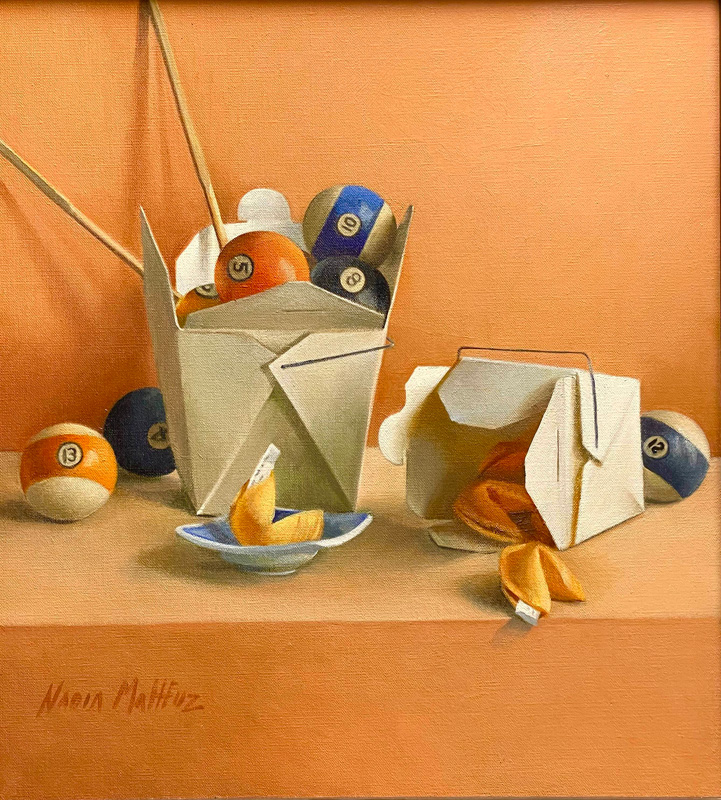 Other subjects that Mahfuz has captured include coils of rope, and linens hanging on a clothesline. In the exhibit there is also one allegorical painting featuring an incongruous grouping of Chinese food containers, fortune cookies, and billiard balls. The unique image is one of Gould’s favorites in the show.