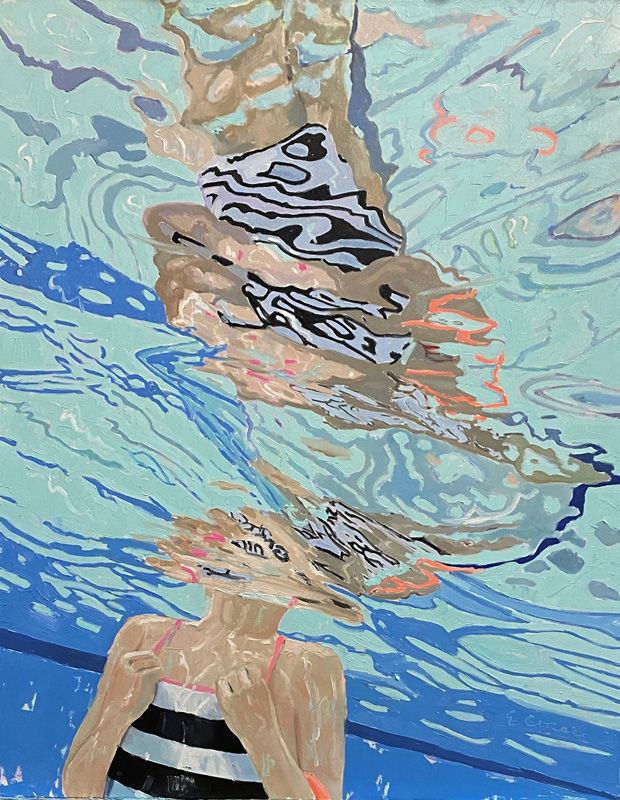 Eileen Corse clearly has a love of the water, as evidenced by her series of images of people swimming, diving, and relaxing on pool floats (along with one of kids jumping off the famous Jaws Bridge). While the figures themselves are done in a realist style, Corse often plays with the effects of water by either using a sort of mosaic technique to create a multi-toned effect, or using swirls of various colors to give the impression of the movement, reflective properties, and distortion of the water. In either case, the result is an image that truly captures the movement of water as it is impacted by the motion of swimmers.