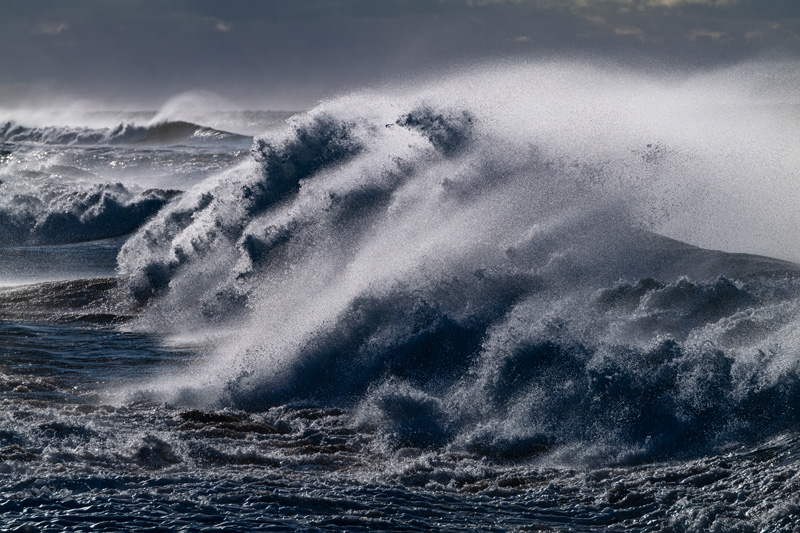 Dahl posed an overall-clad woman, blond hair spilling down her naked back, on top of a camper-like bus parked at the bottom of the path leading through the dunes. It is a quintessential summer image that immediately recalls the late 1970s, when Dahl first started coming to the Vineyard. The exact opposite season is her black-and-white photograph of frighteningly large, roiling waves as they come crashing down on South Beach that Dahl took during a nor’easter. As you linger on the magnificent force of nature, the photograph dissolves into abstract textures and plays of light and dark tones.