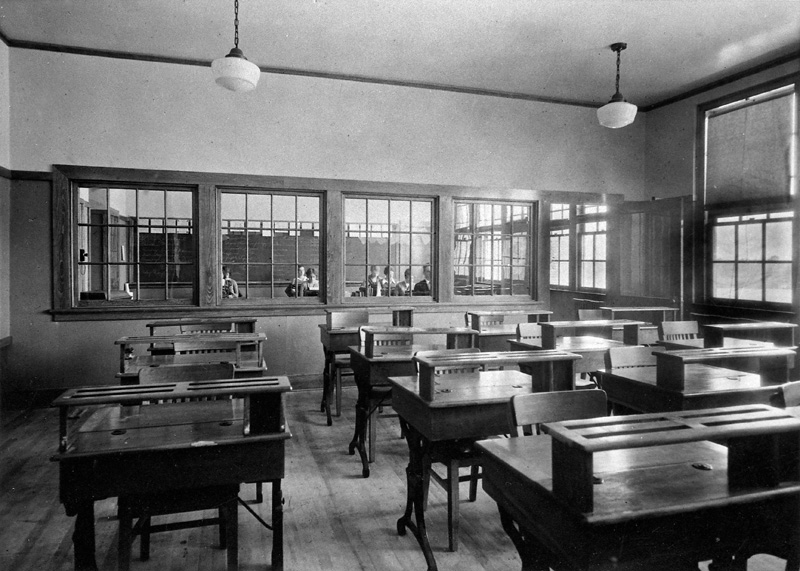 Dr. Mason describes the new building room by room, floor by floor, accompanying his article with the professional photos you see here, evidently commissioned by the architectural firm of Haynes and Mason. He describes the “easy-chairs and drapery curtains all in harmonious colors” in the nurses’ office, “evidently planned to take away from the student the fear caused by the typical hospital style of furniture.” He takes us on a tour of “the generous-size study hall” on the top floor adjacent to the library, “in the front of which hangs a colonial picture of the ‘beautiful isle’ painted and donated by a Vineyard artist.” He writes about the school’s underground coal bin, electrical appliances, easy-access plumbing, and drinking fountains. “Two outside drinking fountains in the yard will contribute much to the mechanical handling of ‘getting a drink’ at recess time,” he writes, gushing, “An interesting feature of all lavatories in the building is the mixing valve, which gives water of any temperature for washing hands and faces.”