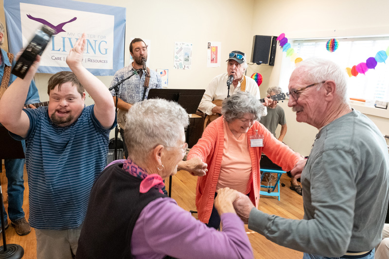 Among the crowd in the newly renovated Center for Living building were members of the center’s Supportive Day Program, which daily delivers exercise, arts, music, yoga, drama, games, and special presentations by local artists, topped off by a family-style lunch cooked by an in-house chef. Friends and family were there, as well as the many volunteers upon whom the center depends.