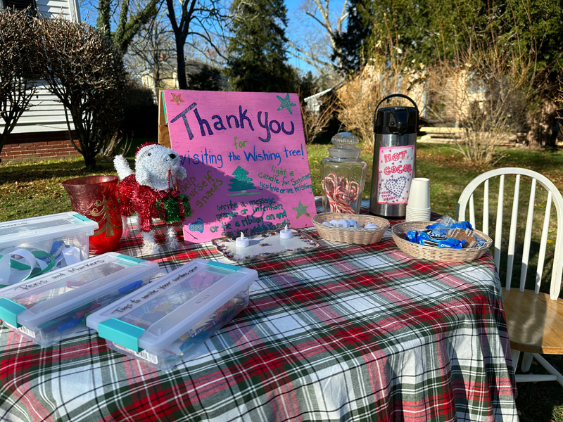 Anyone from the community can stop by. There are paper ornaments, markers to write your wishes and intentions, and ribbon. You might find some younger folks stopping by too, because there are cookies and a warm drink involved. (I figured it was best to leave that for the young ones.) I wanted to know what Polly’s process was after the wishes were all set.