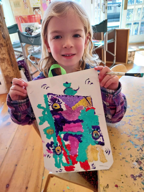 Carney doesn’t just teach children art techniques, however; she also teaches them about famous artists, asks them to think about the impact humans have on the planet, and to care for animals. “This winter term I wanted to celebrate Pablo Picasso. It’s the 60th year of his passing, so our Wednesday class is called ‘Being Pablo,’” Carney said. “The children have loved the stories I’ve shared about Picasso and his beloved dog Lump — how wherever he was painting, he had Lump right beside him. We’ve also played with Lump himself, which leads into our Thursday class, where we focus on animals. We capture their beauty and talk about them. The kids get that animals need our voice to help them. The depictions they paint of the animals flow through their minds and hearts to their hands.”