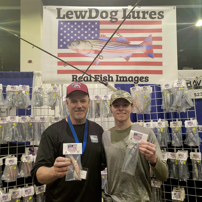 After a pitstop at Striper Maine-iac, I went in search of lunch, and instead found Mark Lewis. I’d met Mark a few years ago during the Martha’s Vineyard Striped Bass and Bluefish Derby at Ron McKee’s Vineyard house. Mark stood in front of LewDog Lures, and I could only smile. I had no clue he made and sold lures.