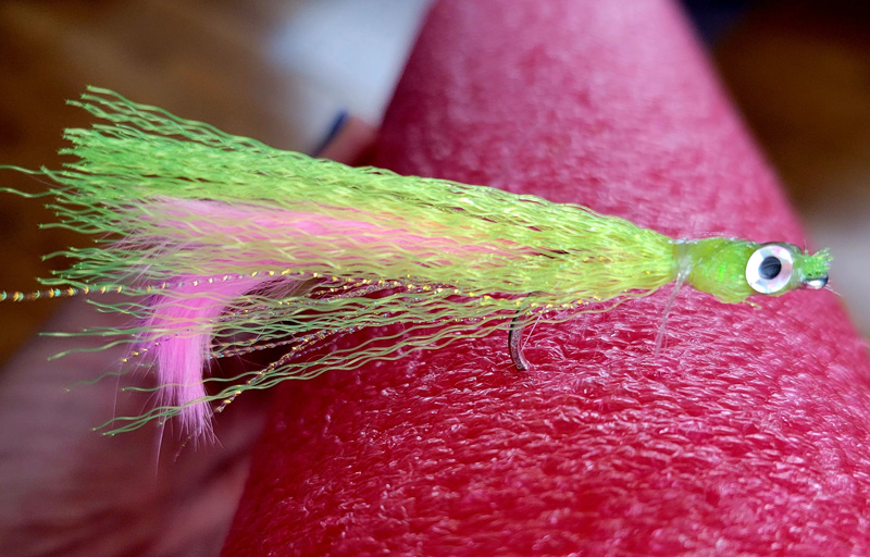 Jamie grabbed some of the chartreuse craft fur, pulled out the short fibers, trimmed the long fibers to match the length of the pink. The top part, or wing, was wrapped only at the top near the eye of the hook. Jamie tied off the fly with a whip knot using a bodkin. I cannot describe this to you. He did it so quickly, I made a note to Google “whip knot.”
