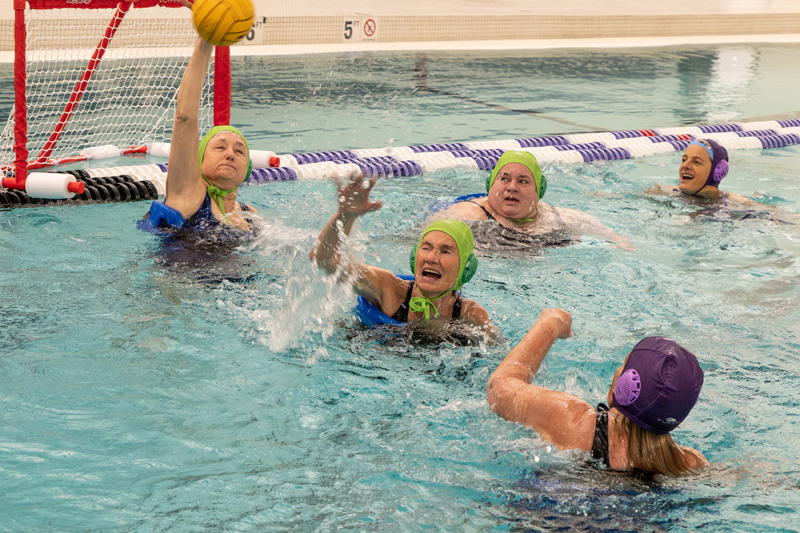 Cindy Doyle appreciates both the camaraderie and the competitive aspect: “I’ve never played water polo before, and it is ‘competitive’ (a nice word for rough), and there are skills you have to learn that are very different from swimming laps. First I had to learn the rules, and then how to catch the ball with one hand — very tricky. Next, I had to learn how to guard the players on the other team so they couldn’t make a goal. I’m just learning about punching, kicking, and scratching, techniques that are very useful when guarding. So far no one has drowned!