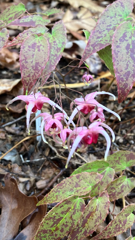 Slow to creep or increase, deer- and rabbit-resistant, and with visually interesting, intriguingly intricate flowers and foliage, epimediums are in bloom and putting forth new growth now. Cosmetic shearing back of old foliage in early spring is epimediums’ only cultural requirement.