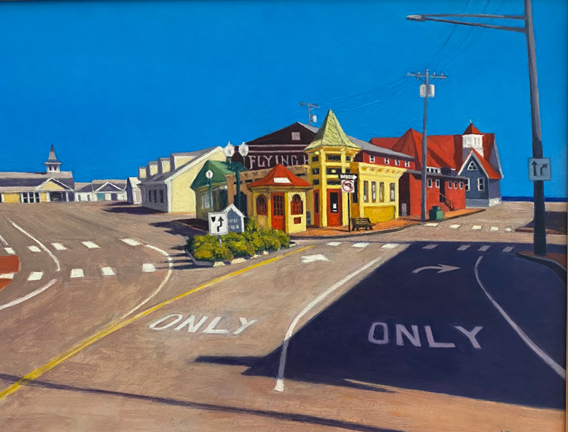 In addition to her portraits, decorative still lives, and conceptual work, A.F. Cook paints scenes of the Vineyard, including a classic location in Oak Bluffs. Empty traffic lanes lead our eye to the visually fascinating intersection, with Circuit Avenue going off to the right and the Flying Horses dead straight ahead. Devoid of human activity, our eyes delight in the architecture’s brilliant, sharp colors in the springtime light, giving “Oak Bluffs Intersection” a timeless feeling.