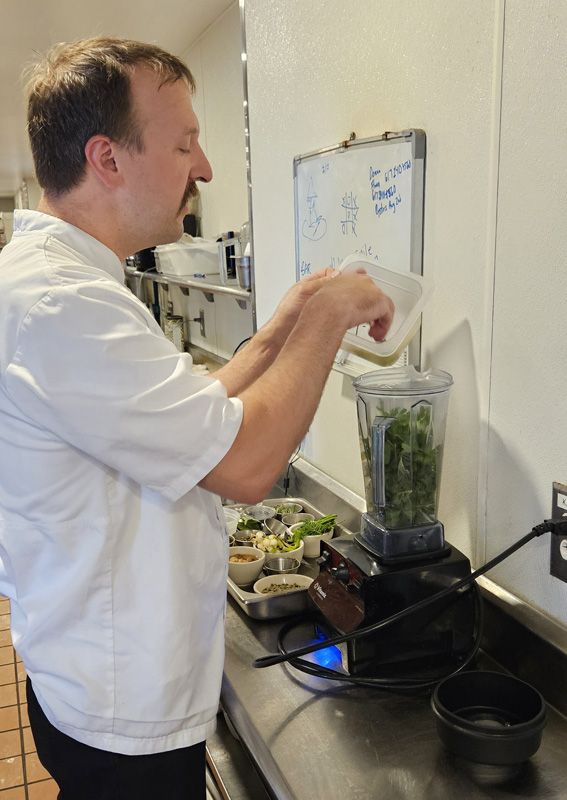 For our “In the Kitchen with … “ Murphy made Pumpkin Risotto with salsa verde and smoked pork belly. “This recipe is inspired by the ‘Fork to Pork’ program,” Murphy said. According to forktopork.com, Fork to Pork was created by Islander Jo Douglas to help address food waste while simultaneously humanely caring for animals. “Jo goes to different restaurants around the Island and collects scraps to bring to her pigs, so the scraps don’t just wind up in a landfill. We also regularly work with Gray Barn and Morning Glory Farm, and many local fishermen,” Murphy said.