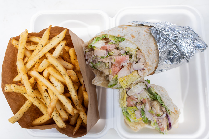 “Seriously, you text them and they will text you back,” she said. I have to see for myself. I text the number, and they text back almost instantly, asking me questions and clarifying my request. I am very pleased with the customer service, speedy responses, and ease of ordering. I order the Chicken Caesar Wrap with a side of Rosemary Fries. My order is ready when I arrive, and they greet me with a smile. I choose to eat in my car while I listen to a podcast about Mike Vrabel returning to my beloved Patriots.