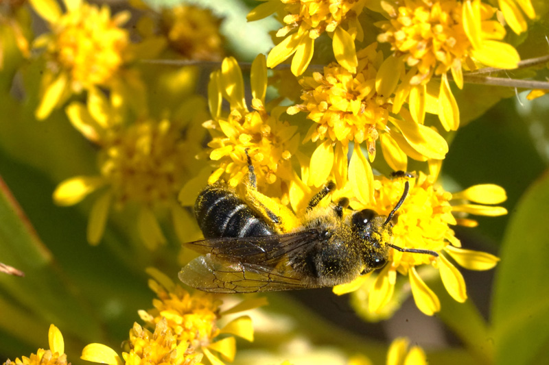 Most strikingly, an entire suite of native bees focuses its adult activity around this plant. Multiple species in the genera Colletes and Andrena are pollen specialists on goldenrod, rarely visiting anything else as they forage, and given a choice, most of these bees unfailingly choose sempervirens over any other Solidago. Many generalist bees, such as the ubiquitous common Eastern bumblebee, Bombus impatiens, also freely visit this flower. So a prime patch of Solidago sempervirens can be alive with pollinators during the plant’s September and early October bloom period.