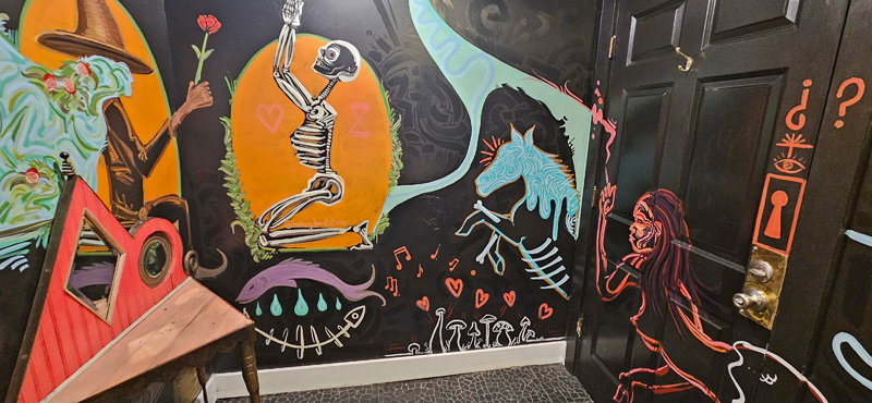 Visual artist Isaac Hurwitz contributed by painting a mural in the bathroom. The walls are black, and Hurwitz’s brightly colored mermaids, skeletons, fish, dragons, and horses pop against the dark. Hurwitz said some of his inspiration came from the film “Holy Mountain,” about a Mexican alchemist who leads a Christ figure and other disciples to a mountain of immortal wise men. “It covers a lot of surrealist imagery, but the books I’ve read recently are also kind of about the alchemical process — base metals into gold, or symbolically, any soul into a spiritually enlightened being,” he said. “So although the mural imagery was definitely not planned in totality, the themes are there — elements ultimately represent different states of being.”
