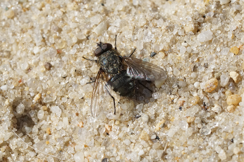 Those Pollenia flies had multiplied from a handful of individuals to scores, and they were joined by smaller numbers of at least two other fly species. Two kinds of parasitic wasps were on the wing, fun to chase but impossible to photograph as they patrolled incessantly in search of suitable targets. Many grasshopper nymphs, undoubtedly present two days before but too inert for me to detect, leapt from underfoot. And tiger beetles, conspicuously absent two days before, were plentiful on the warming soil, emerging from their overwintering burrows to pursue ants and spiders.