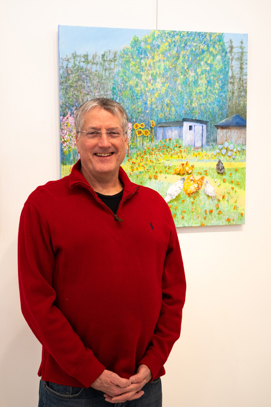 We move into botanical subjects with Mikey Rottman’s mixed-media piece, “Farmland,” which explodes with color. Abstract V shapes in various patterns hint at cultivated fields, with a green, cowlike image anchoring the composition just slightly to the right of center. Brad Permar’s small strokes of oil paint create the gorgeous, nearly impressionist image in “Flower Garden for Hens,” making us yearn for summer.