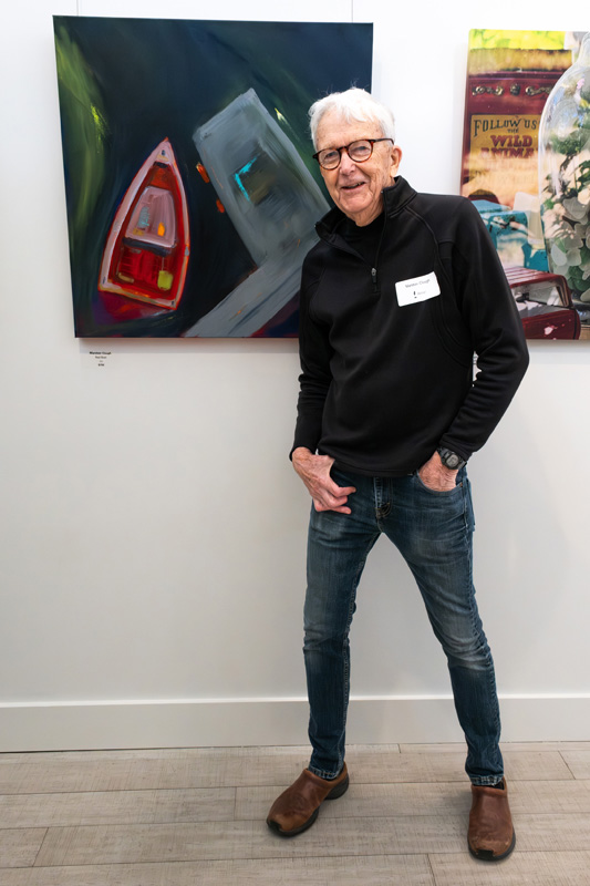 The title of Dom Scalpelli’s oil painting, “Schumann Resonance,” infuses meaning to his landscape, which “resonates” with the expressive Romantic music of the German composer. The arching strokes of purple, blue, red, black, and white fill the entire canvas, creating an exciting background for the few bare trees on the far left.